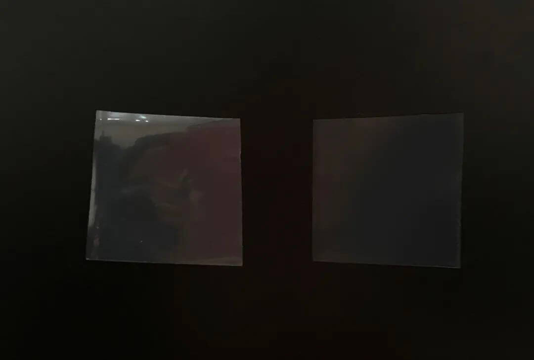 平时没有专业仪器测试PE保护膜雾度的话,也可以利用显示器关机的情况下去观察,方法跟第三点一样,每款剪一块小样然后在中间逐个贴开,颜色越浅,越显屏幕底色的其雾度就越小,雾度越小的说明材质和加工工艺也越好,这个方法也可以替换成黑色的测试板,也非常容易看出膜的差异。